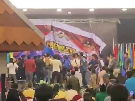Beberapa saat kemudian, massa terlihat merusak spanduk besar kegiatan yang terpasang di depan ruangan. Situasi semakin memanas ketika dua kelompok massa saling dorong, saling mengejar, hingga berujung pada pemukulan.