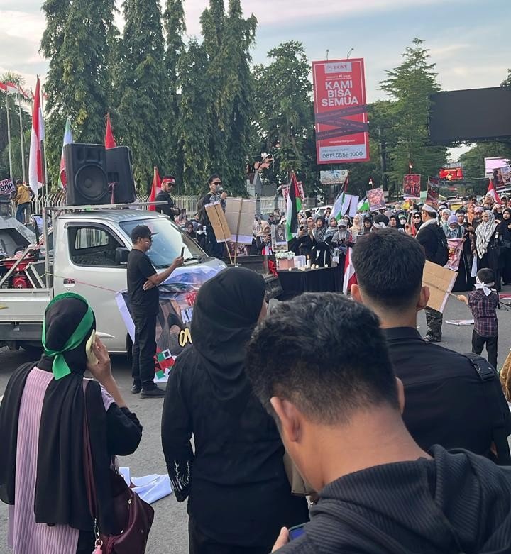 “Israel dan Amerika itu negara mitos, negara kloning. Akan tiba waktunya untuk hilang dan binasa,” ujar salah seorang orator dalam aksi tersebut.