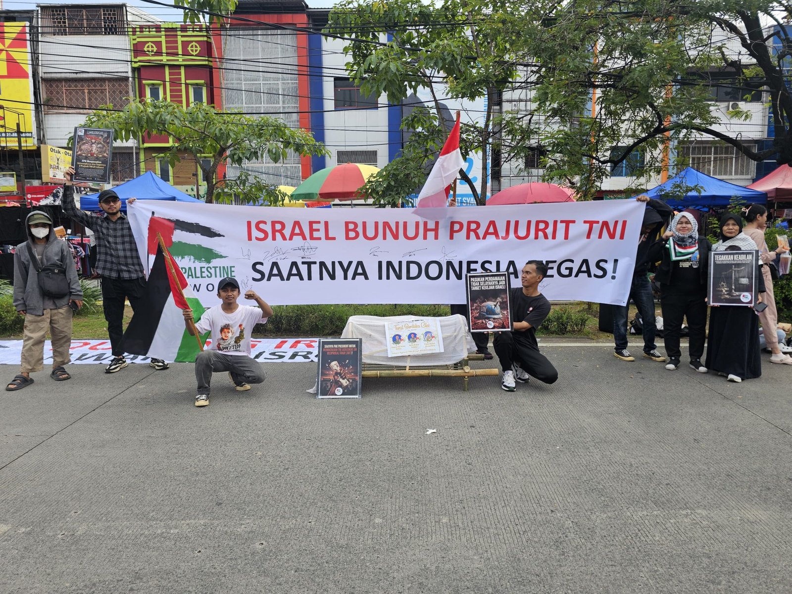 Dalam kegiatan itu, massa FPN membentangkan sejumlah spanduk berukuran besar, masing-masing sekitar enam meter. Pada salah satu spanduk tertulis, “Israel Bunuh Prajurit TNI, Saatnya Indonesia Tegas!”